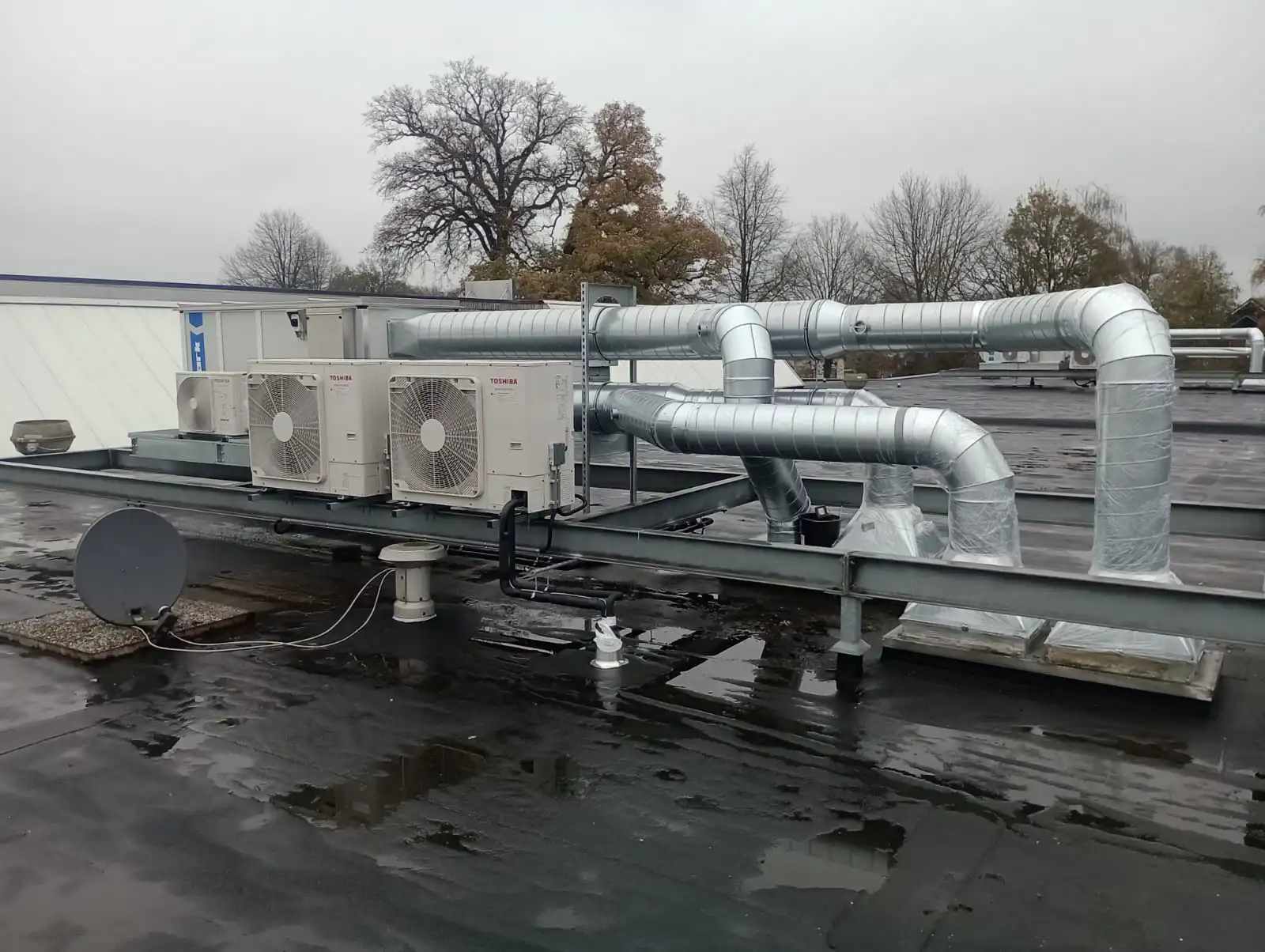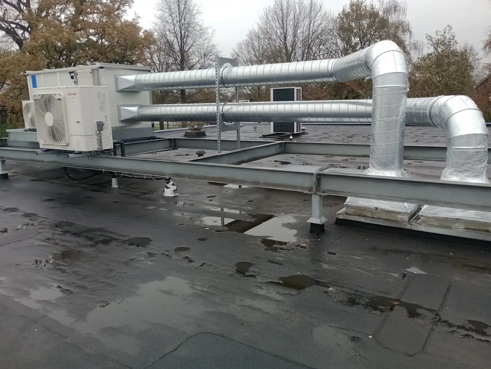 Bij SWB in Hengelo zijn we volop bezig met de realisatie van een complete klimaatinstallatie voor zeven werkruimtes. Voor dit project hebben we vier Mark luchtbehandelingskasten geplaatst. Elke kast is uitgerust met een Toshiba warmtepomp die zorgt voor een constante inblaastemperatuur van 21 graden. Daarmee zorgen we ervoor dat het binnenklimaat het hele jaar door optimaal geregeld is.